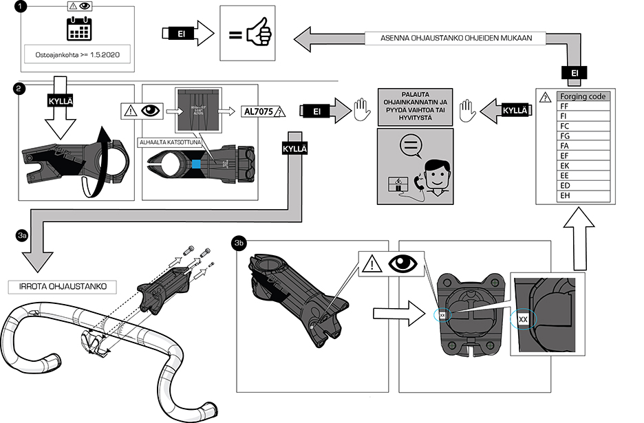Jos pyörässäsi on takaisinkutsun alainen ohjainkannatin, keskeytä pyörän käyttö. Palauta takaisinkutsun alainen tuote siihen jälleenmyyntipisteeseen, josta ostit sen. Jälleenmyyjä vaihtaa takaisinkutsun alaisen ohjainkannattimen uuteen (saatavuuden mukaan) tai tarjoaa siitä rahallisen hyvityksen.