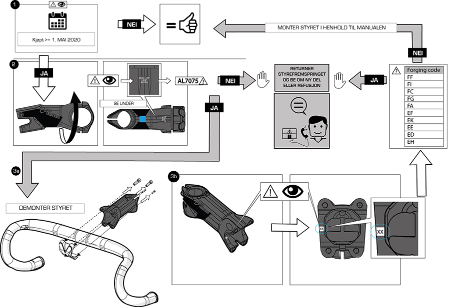 Våre registre viser at du har kjøpt et slikt berørt styrefremspring. Vi ber deg om umiddelbart å slutte å bruke sykkelen, og så følge prosedyren under for å fastslå hvorvidt styrefremspringet på sykkelen din er berørt av tilbakekallingen.